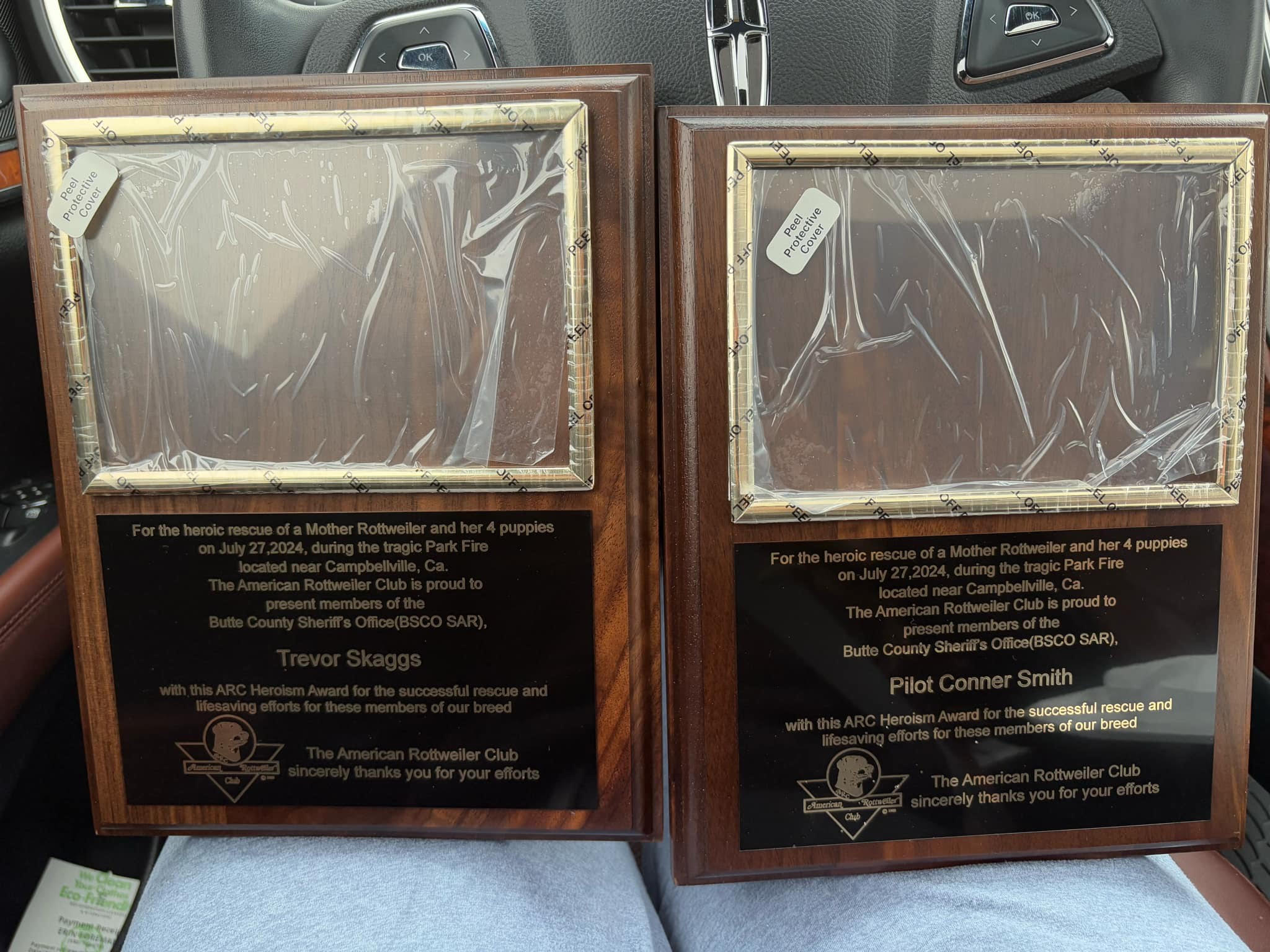 Official Statement from the American Rottweiler Club: For the heroic rescue of a Mother Rottweiler and her 4 puppies on July 27, 2024, during the tragic Park Fire located near Campbellville, CA, the American Rottweiler Club is proud to present members of the Butte County Sheriff’s Office (BSCO SAR), Pilot Connor Smith and Trevor Skaggs with this ARC Heroism Award for the successful rescue and lifesaving efforts for these members of our breed. The American Rottweiler Club sincerely thanks you for your efforts.