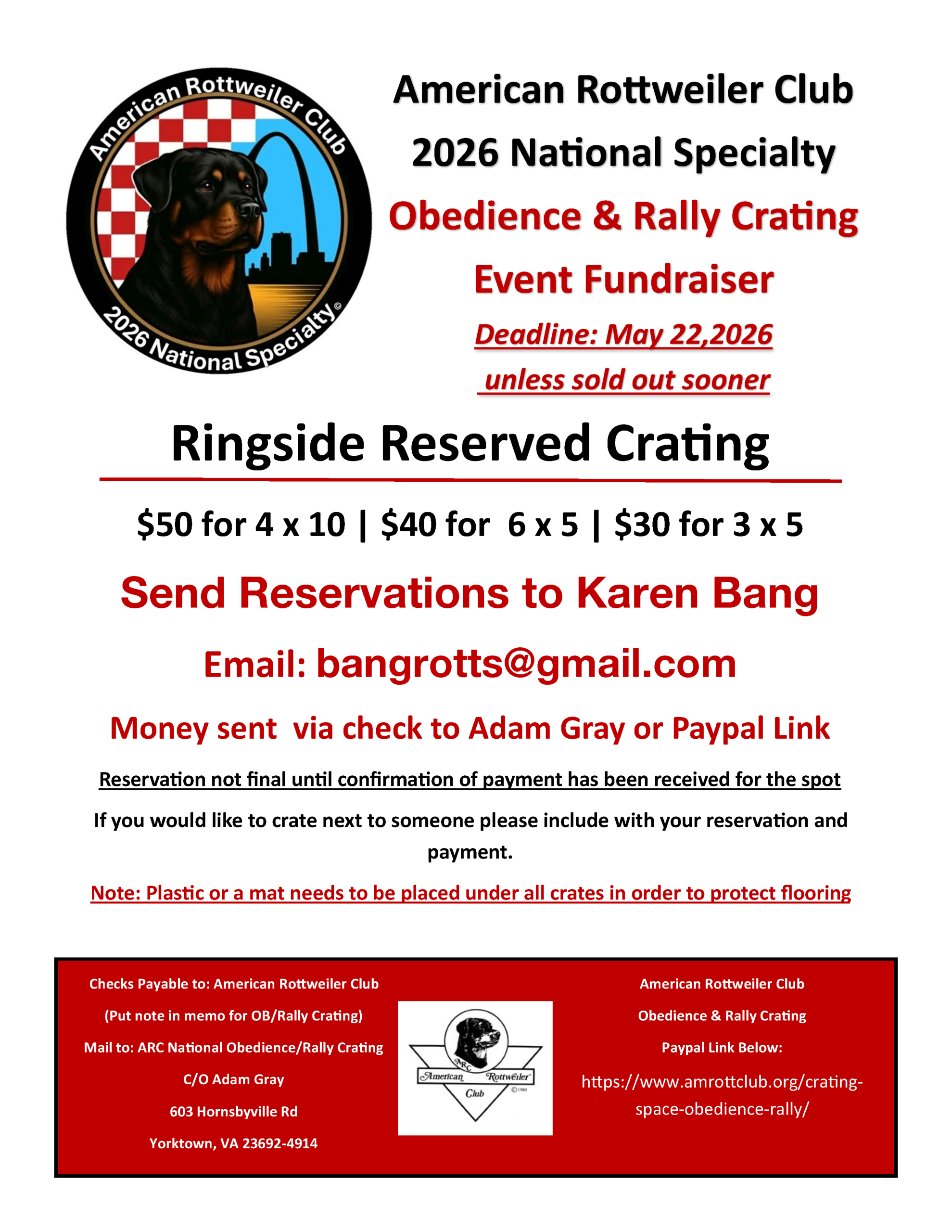 Obedience & Rally crating for the 2026 ARC National Specialty is available now. Space is limited and reservations close May 22, 2026, unless sold out sooner.