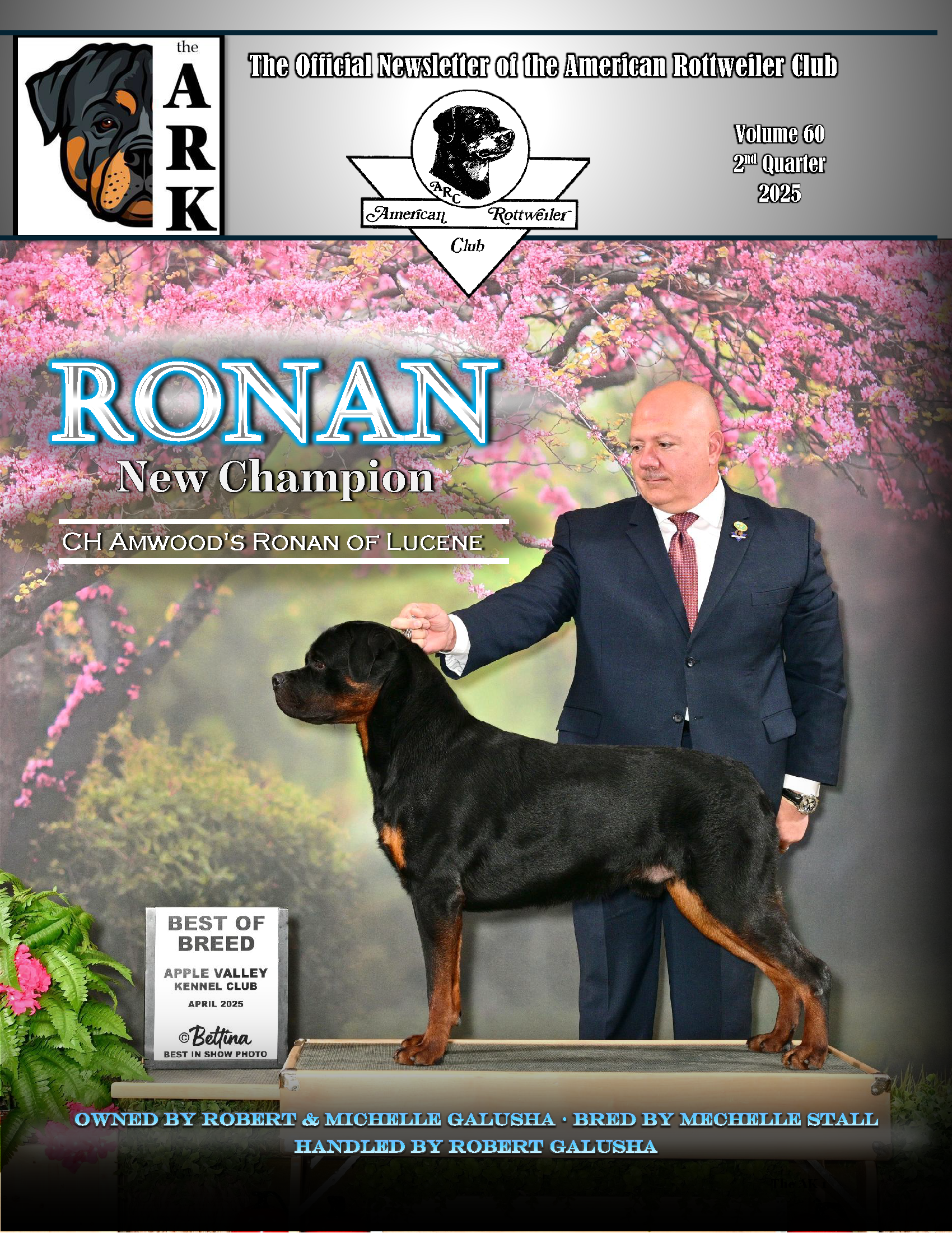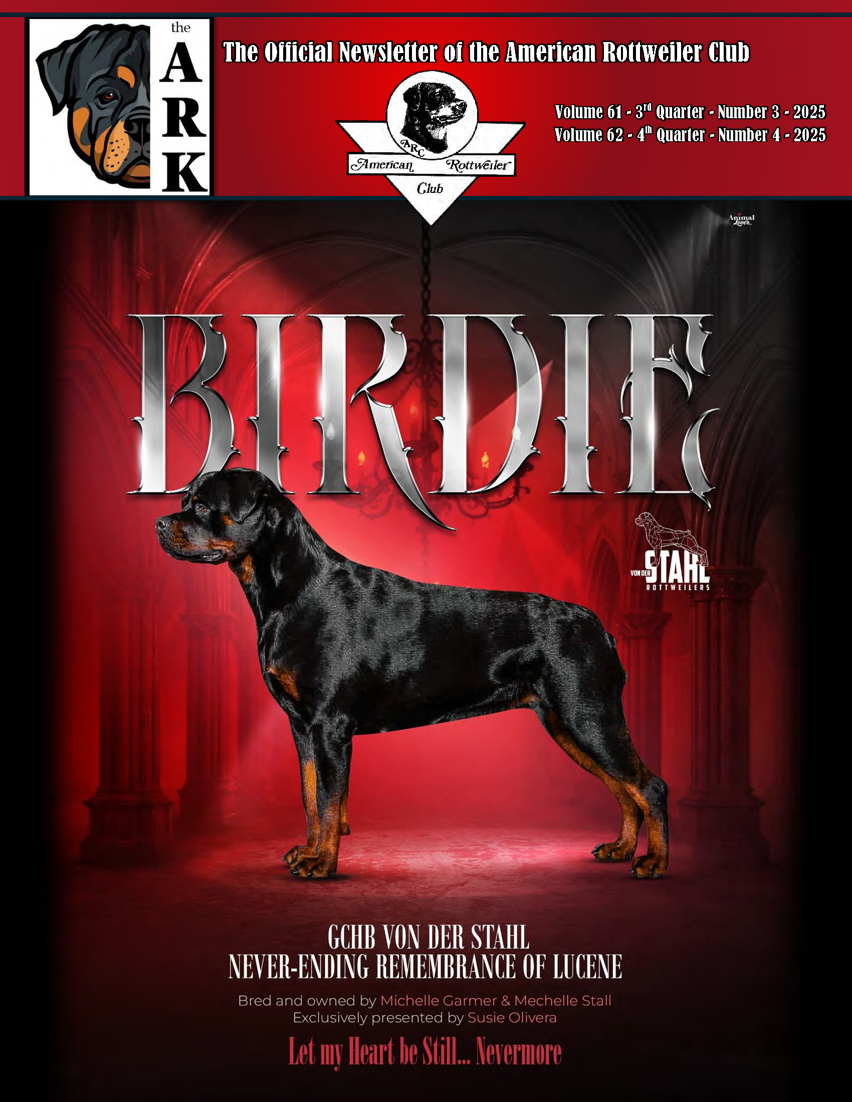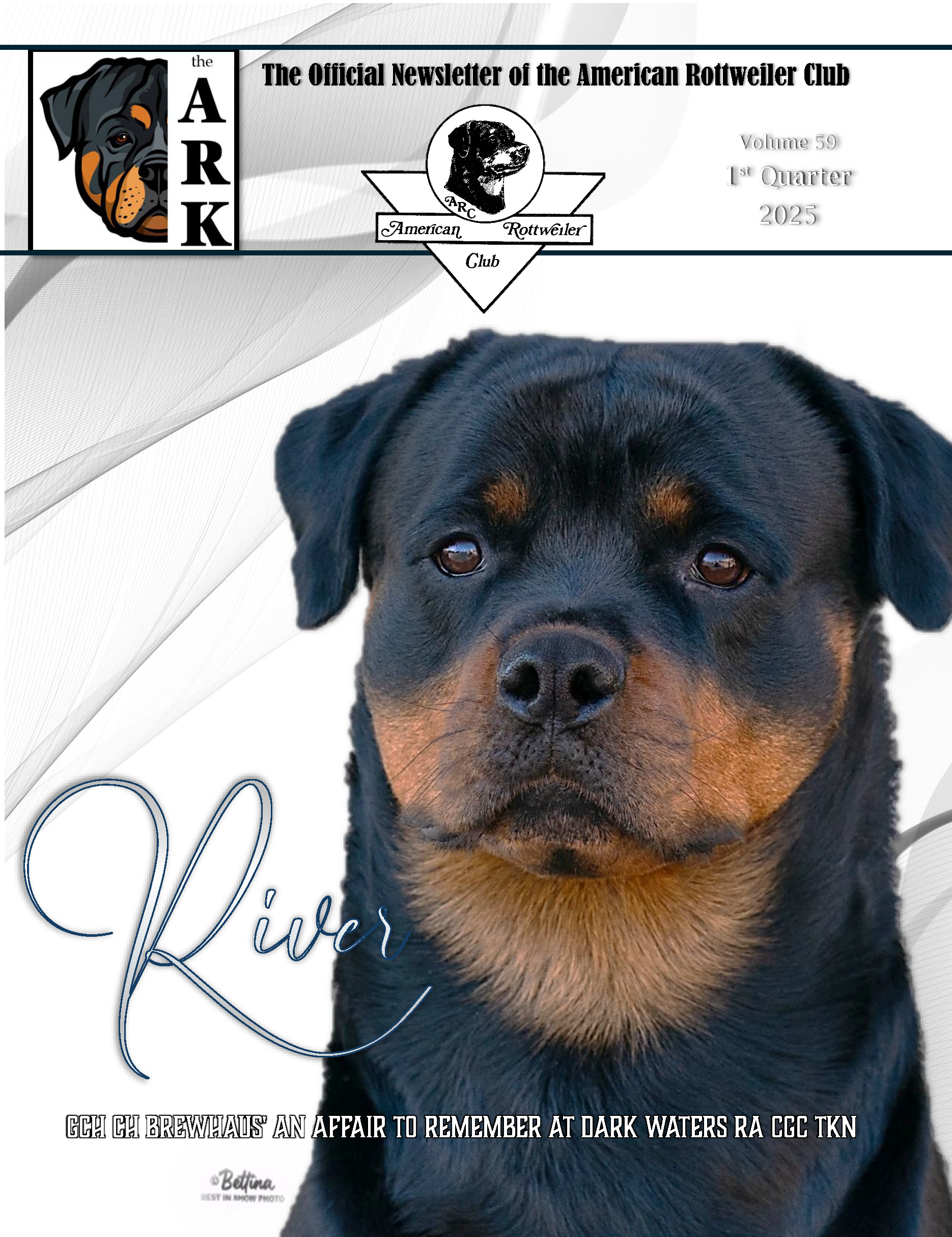 Published quarterly, The ARK is the official newsletter of the American Rottweiler Club. Each issue is designed to educate the public and our members about the Rottweiler breed and the work of the club. Inside, you’ll find updates on club activities, health and training topics, dog sports, breeder and litter advertisements, and more. An annual National Specialty Show Supplement is also included.